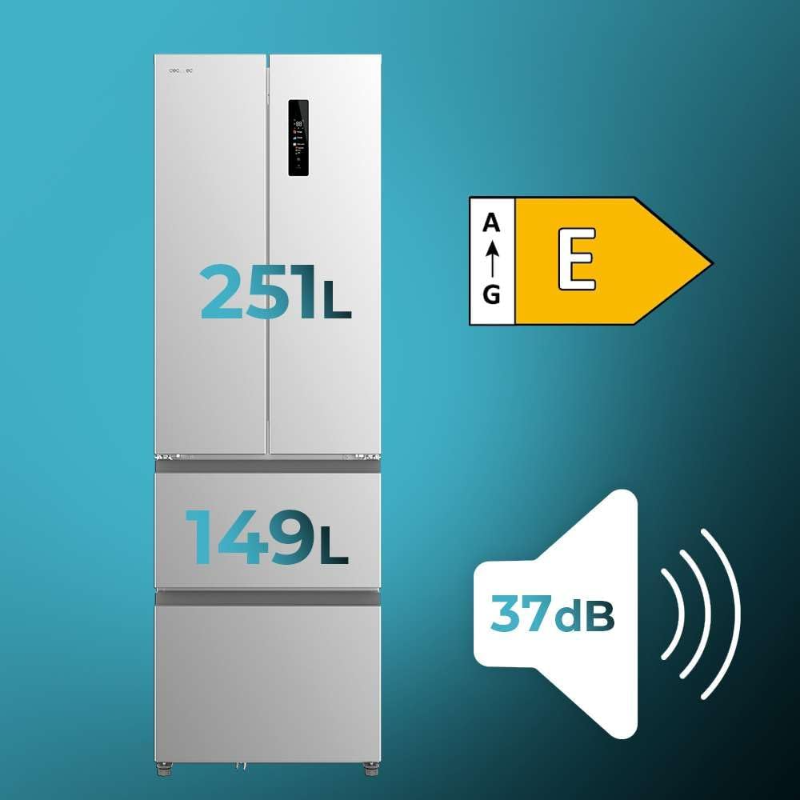 El Cecotec Bolero CoolMarket Combi F2D 400 Inox E es un frigorífico combi de libre instalación con una capacidad total de 400 litros, diseñado para hogares que requieren un almacenamiento amplio, eficiente y organizado de alimentos. Es adecuado para familias medianas o grandes, personas que cocinan con frecuencia o que desean conservar alimentos frescos durante más tiempo sin preocuparse por el consumo energético.