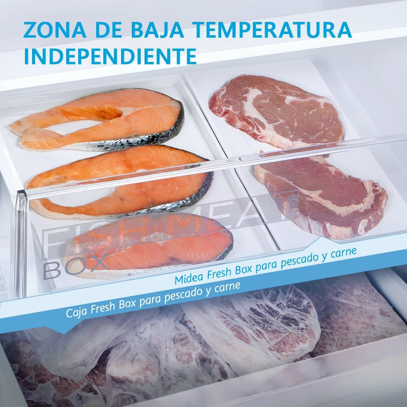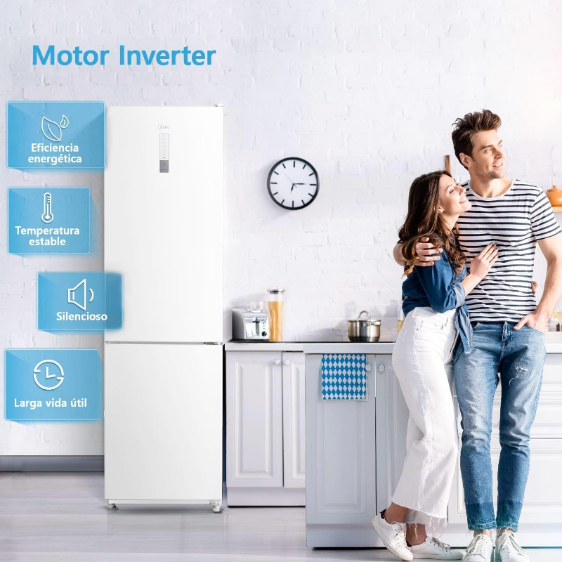 El Midea Frigorífico Combi No Frost es un electrodoméstico de refrigeración vertical diseñado para conservar alimentos frescos y congelados de forma eficiente. Está disponible en dos alturas (188 cm y 201 cm), con un ancho estándar de 59,5 cm, y se presenta en acabados blanco o inox. Su capacidad total varía entre 224 y 256 litros, lo que lo hace adecuado para hogares de tamaño medio que buscan una solución práctica y moderna para el almacenamiento de alimentos.